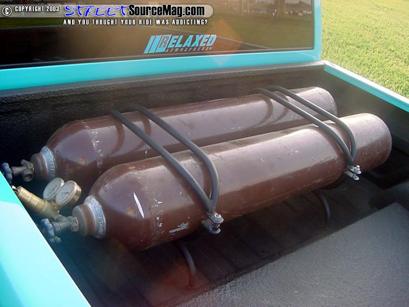 So the truck is looking good and sounding good, lets get into the suspension! To get the truck in this great stance that you see now, Mitch and his crew at Just For Trucks body dropped the truck 2 ½ inches. Lifting the truck comes from a complete Extensive Metal Works air ride kit. Up front Mitch installed 2600lbs bags and KYB shocks and belltech drop spindles to get the truck down on the pavement.