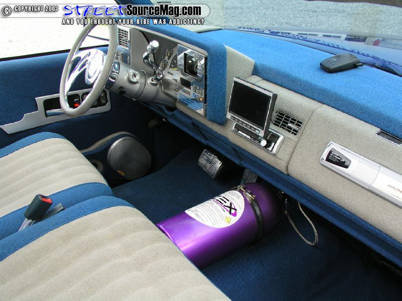 Billy decided to keep the factory 60/40 bench seat since he loved how comfortable it was but decided to ditch the head rest and have the seat covered in the same blue and silver tweed. To accent the rest of the interior a Billet Specialties "Revolver" steering wheel along with numerous other billet items were added.  Not wanting to be bored while cruising the bayou Billy decided an Audio/Video system was in order. So Billy chose an Alpine CVA-1005, 5" LCD screens in each visor and a 4" LCD Monitor was installed were the factory radio control unit once resided. The Alpine CHA-6538 Mp3 6 disc changer and an Alpine DVD unit were then tossed into the mix. A pair of Boston 6x9's were added with custom flame accents to the doors along with Boston 1" NB-1 tweeters. Boston 4x6's were added to the dash and the factory rear locations received another pair of the Boston 6x9's. For power a Rockford Fosgate Punch 400x4 was added to the highs along with a Punch 360 to power the 2 Bazooka RS1004 subs that were installed in a down firing enclosure beneath the rear seat.