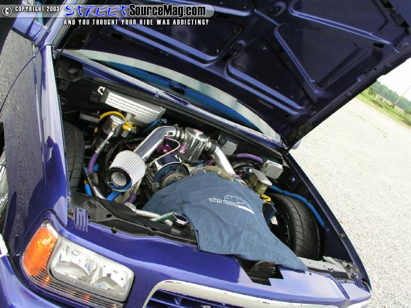 Now that the interior and exterior was in true Caddy style it was time to add some much needed power to the Cajun Caddy. Chevy really hit a high note when they introduced the 4.3 liter V-6. This motor has truly been a success story for Chevy but when installed in a fullsize truck it always seems to lack in the ponies department. Billy not being one to leave anything alone decided that the wore out V-6 needed a little freshening up.  So it was pulled and given an internal makeover. The block was line bored and then balanced and blueprinted to ensure reliability and dependability. While the block was tore down it was treated to the same color treatment as the exterior was. Next the heads were ported and polished and the valves were reworked with a 3 angle valve job to ensure proper seating. A Crane Compucam camshaft was then installed along with Crane 1.6 roller rocker. Accell was then called upon to supply the ignition system to supply the spark to the now built V-6. For induction a Holly Projection throttle body was installed to supply the much needed fuel and air to the V-6. Not wanting to take any chances of getting smoked at the track Billy decided that the ZEX 65 shot of the laughing gas was needed to help out. To get spent gasses away from the truck a Quickflow Exhaust system was then installed. Billy now had the combination needed to push the Caddy down the track, turning some low 15-second passes.