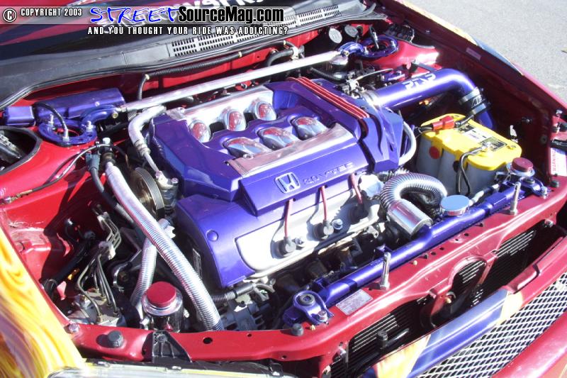 Turning his attention to the engine compartment Justin noticed it was lacking the same luster as the exterior and interior. So he polished the intake manifold, custom painted several items and then added an AEM cold air intake. To replace the nasty stock hoses, Cool Flex hoses were then added for coolant circulation functions. To ensure the proper fire power reached the motor a set of Magnecor plug wires were added. A Comptech header backed up by an all polished stainless steel 2 ½" exhaust with a polished cat and a pair of Greddy polished mufflers were added to ensure the Accord was not all show and no go.