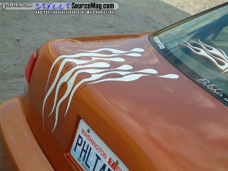 With the body now smoothed out and shaved Tanya would have Jason Knauff of Kravits Kustoms, Spokane, WA lay down the new PPG Lemans sunset pearl paint. Not satisfied with the single color paint, Tanya would have Jason through down his skills on some white with orange pearl flames through the doors, hood and trunk lid.