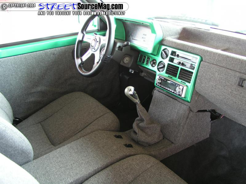 To make the seats match Josh at Leather Trim in Fort Worth, TX was called upon to wrap the stock buckets in gray tweed but minus the headrest. To add accent to the dash Jimmy had several items painted to match the Planet Green exterior hue.