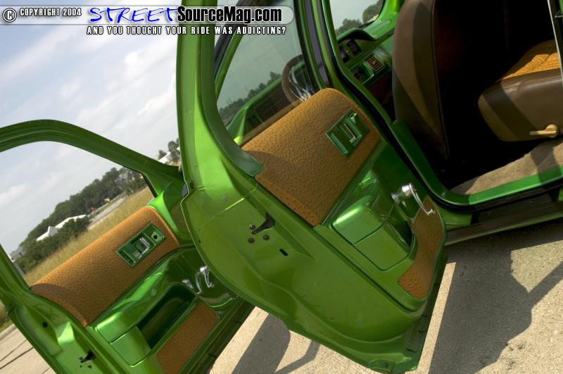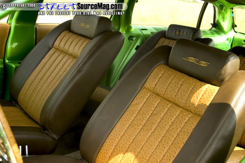 For the seats they switched out to four Impalla SS buckets all of which were covered in Ostrich and brown vinyl. The door panels were also given the same treatment along with some billet knobs to go along with the Trenz billet steering wheel and rear view mirror.