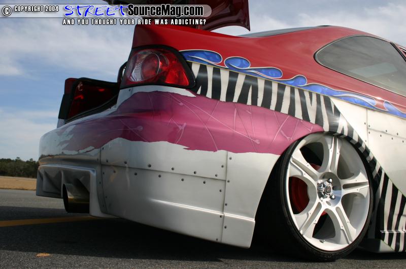 Starting with the exterior Gary and his staff at Street Styles began stripping the car of its stock parts. First the hood was unbolted and tossed, and it was soon followed by the stock bumpers, side skirts, and stock lights all the way around. In there place Black Widow bumpers and side skirts where bolted up, APC lights were fitted and snugged tight in the front and the back, and a Sho-Um lexan hood was installed.