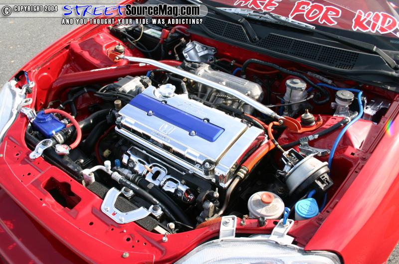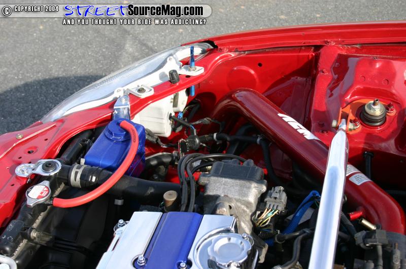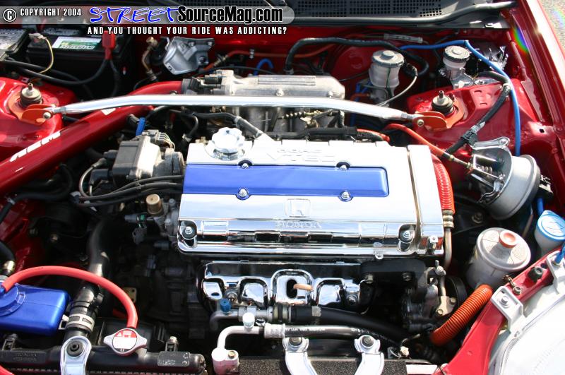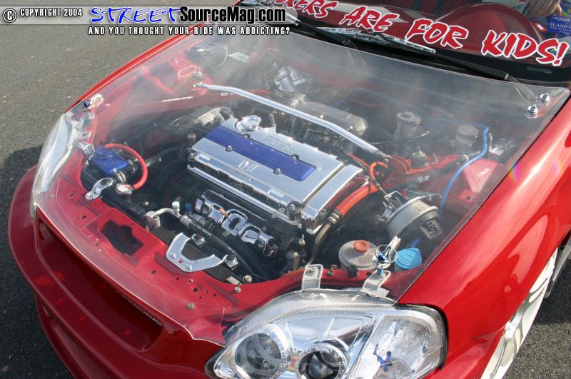 Through the clear hood you can view the B16 motor swapped in by DBI Performance. An AEM intake insures that Gary’s Civic always gets cool clean air while a Chrome valve cover, strut tower brace, and color matched rubber lines keep the engine bay looking clean.