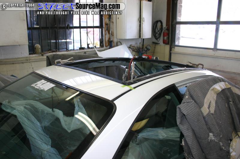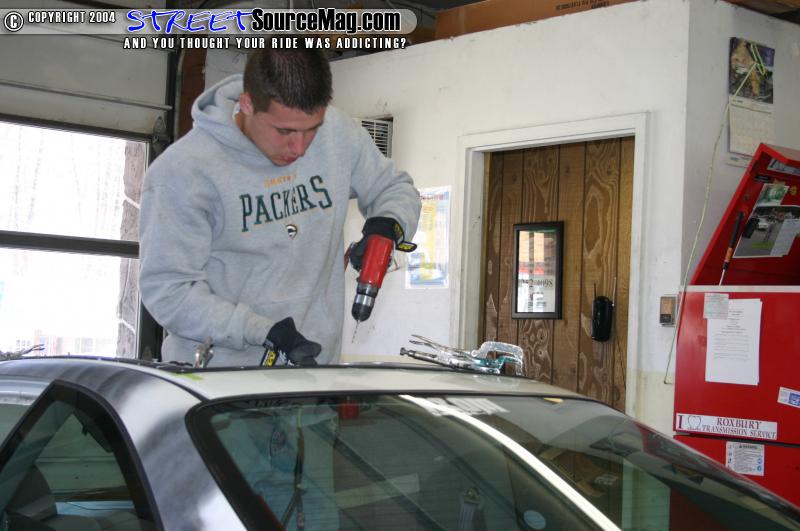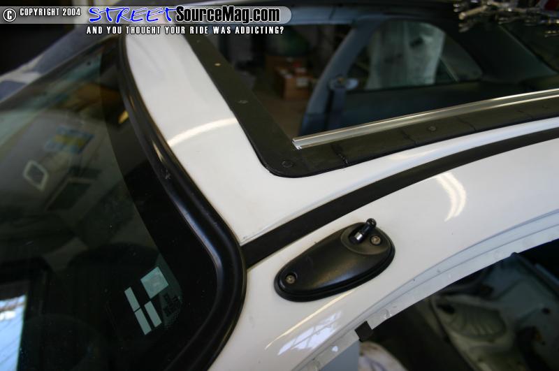 Since I work at a body shop that often uses silicon sealants we decided to use heavy-duty window and panel sealer used for sealing windows in cars and body panels. We spread a ½” thick bead around the area where the rag top frame is going to rest. Be prepared for a mess when you are doing this, I suggest you have some rags and lacquer thinner/cleaner close by. You will need a couple people to lift the ragtop into the hole. First make sure that the hole for the rag top lock is in the front. Lower the frame assembly into the hole and squeeze it tight to the roof being careful not to dent it. We used heavy duty C clamps to hold the frame tight to the roof, be careful not to make them to tight because you may dent the roof around the frame. We clamped the frame down on both sides and the front and back. We waited approx. 2 hours before we began any drilling. The silicon that is being squeezed out will take you a decent amount of time to clean up. After we were all cleaned up we cleared the silicon out of the holes so that the studs could be pushed through. Tighten the studs all around the roof by pushing the studs into the holes and using the washers and nuts from underneath. Be careful not to over tighten any of the studs. Next you can silicon around the inside of the studs if you feel the need to go the extra mile.