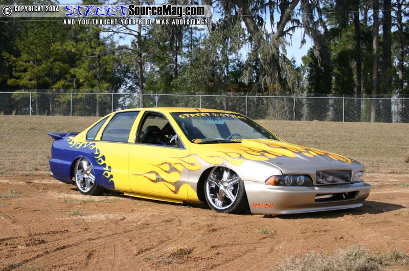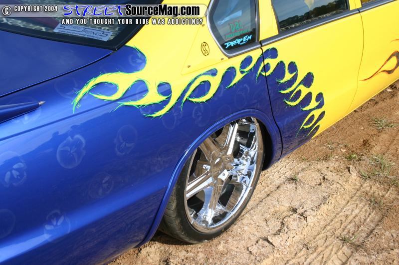 With all of the bodywork complete and the fabrication over it was now time for Jason and Gary Young at Street Styles to lay down some paint. Gold flames start off in the front which fade into Giraffe print graphics, these are followed by Dupont yellow which flows into the doors and quarters and has a flame graphic at the end, the color then goes into a dark blue which was accented with ghosted skull graphics. The car was then cleared and buffed to perfection.