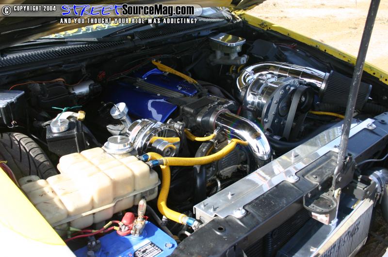 With the overall appearance of the car done, Jason was then ready for the next step in his build up. An LT1 motor out of a 1996 Corvette was bolted up to the chassis. The motor was fitted with Polished pulleys, Polished valve covers, and a Power Master 200amp alternator. Edelbrock headers connect the 2 ½” pipes to the Ractive mufflers. The motor gets most of its horsepower from the ATI Procharger supercharger.