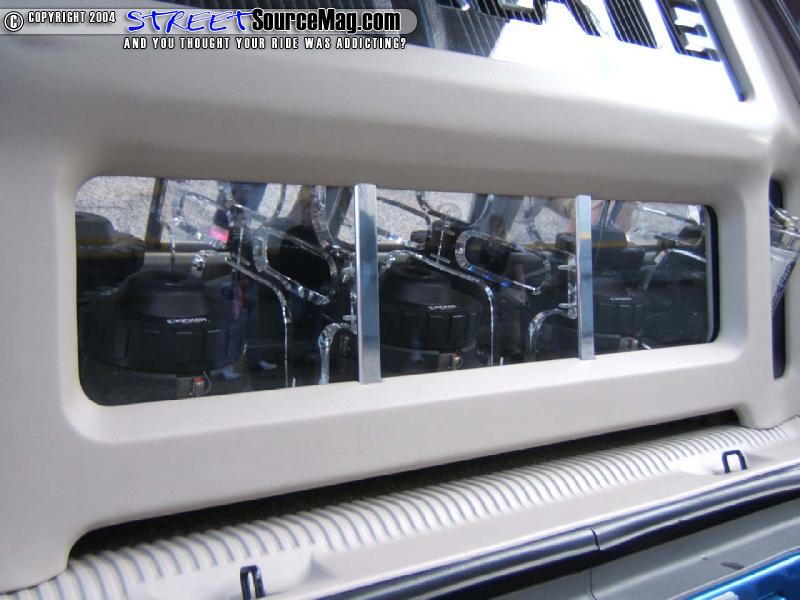 Then the guys at Paradyme mounted 3 10inch Kicker Solo Baric subwoofers in a custom made box behind the third row seats and the rear hatch. The Kicker amplifiers are mounted above the subwoofers with custom blue neon and plexi-glass cut cover with the word “ESCALADE” etched into it. Then custom made kick panels were made to house the upgraded components speakers.