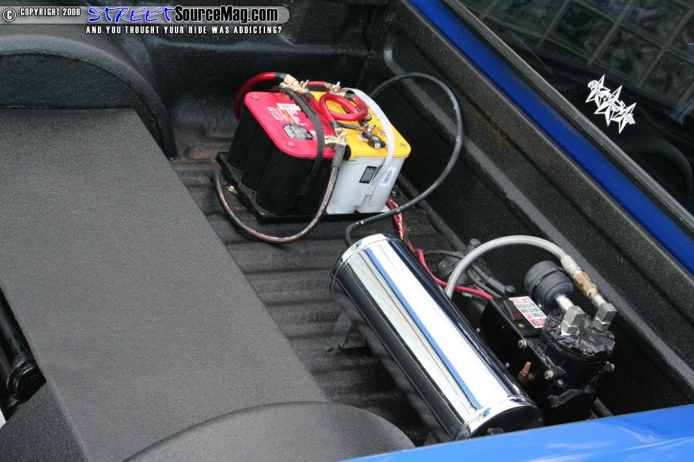 Without the aired out suspension this truck would not be able to cuddle with the 17x7 Centerline Daggers wrapped in 215 40 17 Kumho Fires. In the front the bags made their resting place on the radius arms. In the back they rest on a cantilever 6 link all being fed by ½ inch lines and valves.