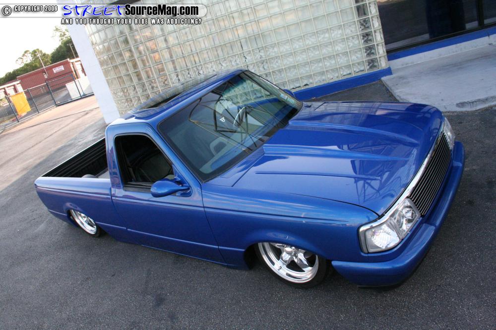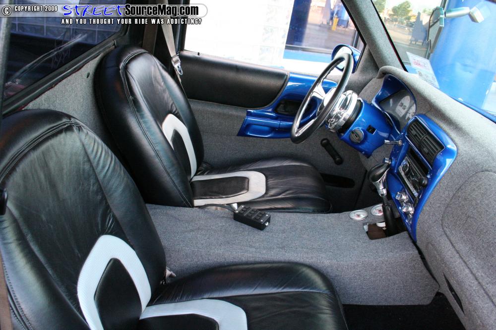 Blinding the driver on those sunny afternoons is executed by the Billet Specialties steering wheel, billet rear view mirror and billet shifter knob. The factory seats were chopped to a smaller size and covered with black leather and silver ostrich hides. A custom console was made to house the air gauges with a space for the shifter to peak through and was covered in grey tweed. Keeping the factory style carpet was not a hard task with the stock floor bodydrop and center console covering the center that was modified to fit over the transmission and driveshaft tunnels.