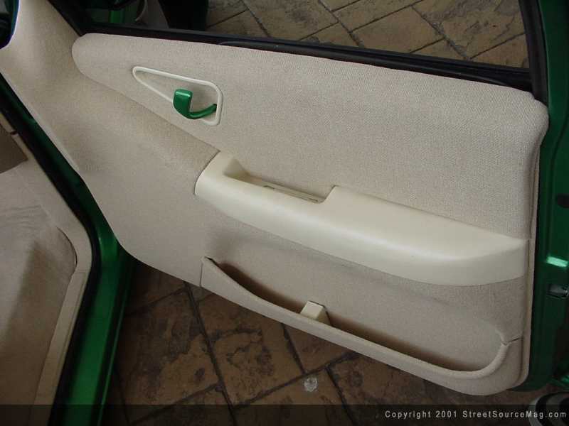 The interior was one of the last items at hand. A custom dash that molds into a center console and houses the power window controls, air gauges and air paddles was created. Along with the custom dash, new door panels were made to match. A Ford Contour SVT gauges cluster was added into the custom dash for a new look. A custom tan tweed headliner was then made and installed. The interior work was performed by Matt along with Eric from KustomWerks. To take care of the seating arrangements, Integra bucket seats where used front and rear and wrapped in sand tweed & vinyl, which was done by Action Auto.