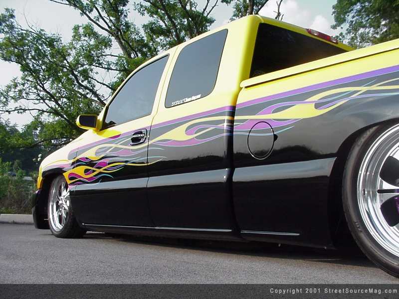 For the last 16 years, Pat has been living out part of his probation sentence – to build show trucks that turn heads everywhere. Not only does the ride Pat build need to win shows, but it has to be good enough to be a rolling business card for his graphic arts business, Maxwell Designs. In late 1999, Pat picked up a brand new Sierra. Six months and $20,000 later, people would come to recognize Pat at every event he attends.