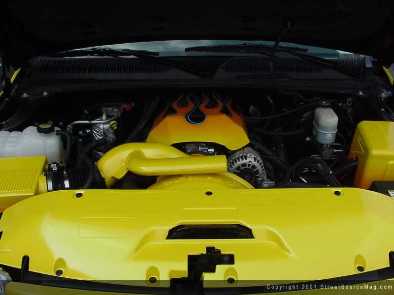 Last, but certainly not least, Pat’s 5.3 Vortec was treated to some customization of its own. Texas Motorsports created an aluminum air induction for Pat’s engine, and Pat himself added the flamed graphics. Dual Flowmasters and a Hypertech reprogrammer help squeeze a few more ponies out of Pat’s engine.