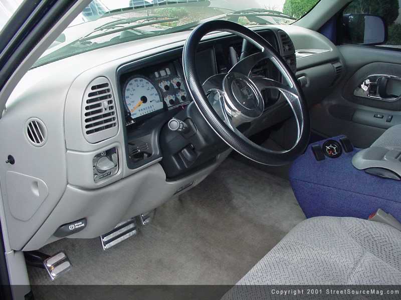 Inside Nelson’s dually, you will find a ton of items to compliment the work already performed. Nelson first contacted Godfather’s Customs for some bolt on goodies to accent the interior. Trenz billet dash inserts and door panels were put in place and APC white face gauges were also installed. A Billet Specialties GT53 steering wheel with carbon fiber ring was added as well.