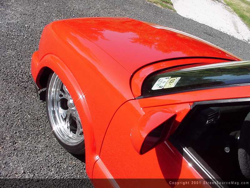 In helping bring the front down to match, a set of Bell tech spindles would be bolted up along with shocks to maintain a respectable ride. In today's scene ride height adjustability is a must, knowing this, a set of Firestone airbags where installed at all four corners along with Ekstensive's very own valves to allow the air to pass through at high speeds. With the suspension in place and the undercarriage resting firmly on the flat surface of Mother Nature, it was time for the crew from Ekstensive to bring the body down level. Performing a 2-½ inch body drop was found to be plenty to even things out. Now what's unique about this drop is the fact that the heater and air conditioning was all kept in tact. With the engine dropped the stock hood closes firmly leaving just enough room to latch.