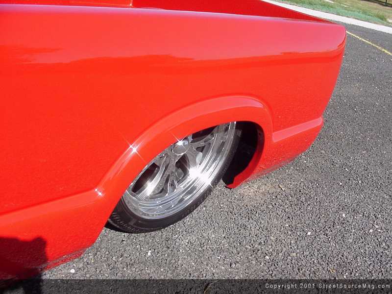 Now with the S-10 laying body evenly on the pavement, it was a must to start working the exterior to complement the low stance. Performing the exterior modifications that would help this mini stand out would be Pats Auto of Houston, Texas. While there many modifications to the body would be worked and smoothed. Starting in the rear, a custom roll pan would be molded to the bed. Keeping with the smooth look, the taillights would be ditched and LED's would take their place into the newfound roll pan. After the tailgate being welded shut completing the ass end, it was time to head to the front. On the way forward, the bodylines would all be smoothed out and the gas filler door would be shaved and relocated into the bed.