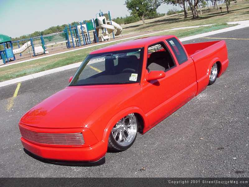 With the cab touched up, the front clip was all that awaited the customizing skills of Pats Auto. The front is where the unique modifications reside. With the custom grille with billet inserts bolted up, the front blinkers would be cut and molded into the grille shell itself with LEDs. Next the crew at Pats Auto molded the shortened 94 full-size Chevy front bumper to the fenders.