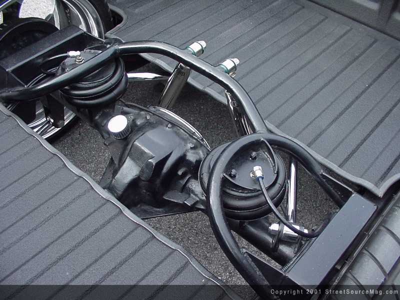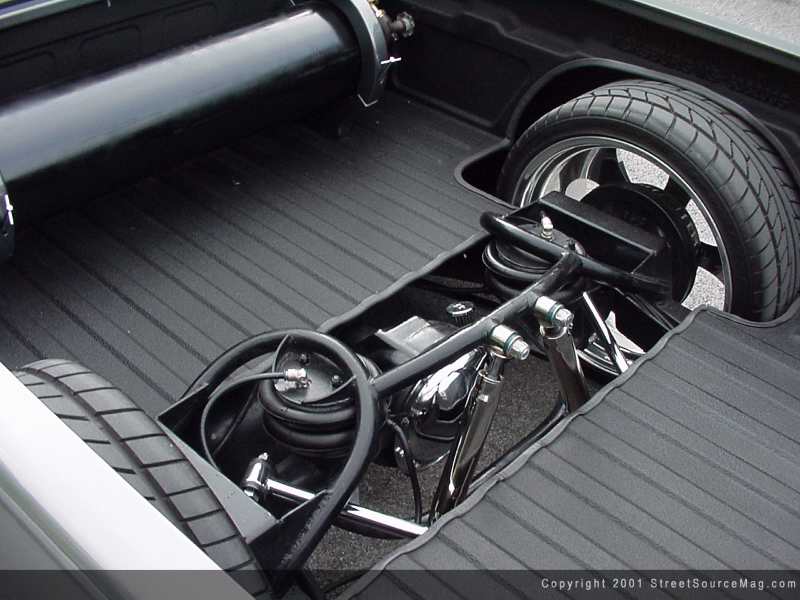 With the bodywork complete, Rick decided it was time to move to the suspension aspect of his S-10. Rick likes attention and the best way to get attention is to be low. You see, Rick's not scared to drag. He needed someone to help him get his S-10 to a ground-dragging stance. Adam Knape of Alvin, Texas stepped up to the plate to do just that. To get things started, Adam installed a set of Bell Tech 2" drop spindles, then installed a set of 3/8 ported Firestone 224c bags in the front to get enough lift to drive. Adam next notched the lower control arms, which allows the Doetech shocks to fit nicely in the front of Rick's S-10, still allowing full turning radius.