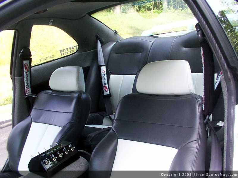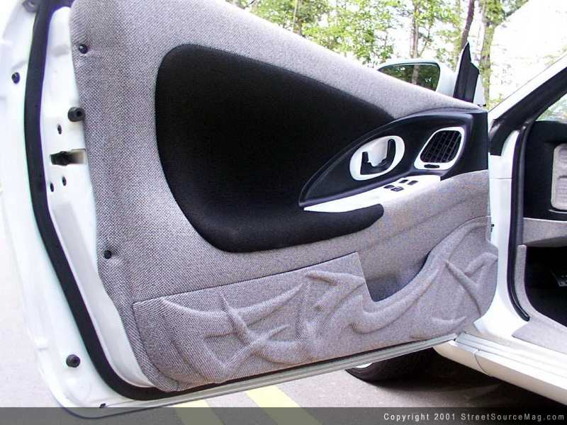Once you've taken in the entire exterior, your eyes move to the full out custom interior. All three seats have been wrapped in gray leather with white inserts. The rest of the interior you'll find several yards of gray and black tweed in the company of tribal graphics in everything from the dash to the rear deck lid.
