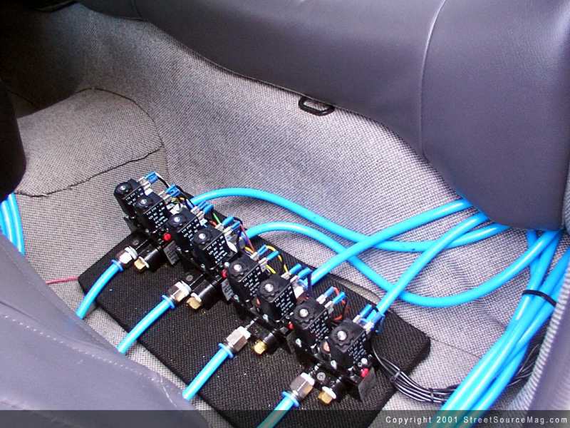 Making sure the Sebring would have a round-hugging stance, Scott decided to use a full air cylinder set up. This was done by using 6" cylinders from Blow Jax on all four corners. The entire air system is controlled by a 10-switch box with the addition of 2 reverse valves used to "suck" the rear wheels into the fender wells for a standing dogleg.