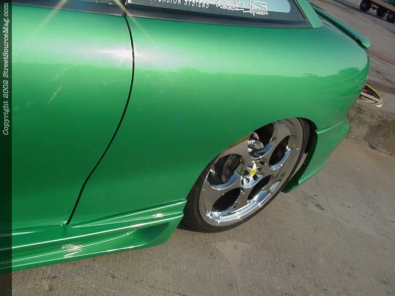 The door handles would be shaved along with the antenna, which was relocated into another location. The 3rd brake light would be shaved along with a custom door and relocated gas filler.   For the hot summer days Angie decided to have a sliding ragtop installed allowing the sunlight to shine through. A set of APC projector beam headlights along with Altezza style clear taillights where installed to finish things off. Ronald Remsey of Collinsville, OK is responsible for the bodywork.