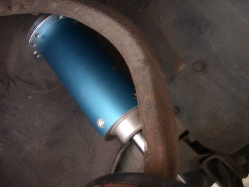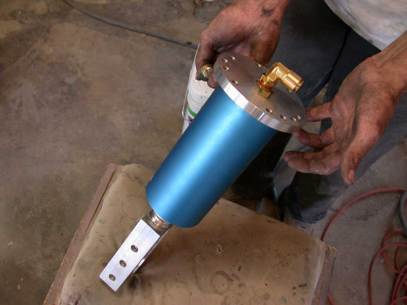5. The rear EAI cylinder assembles just like the front ones, quick and easy. (DO NOT OVER TIGHTEN BOLTS IN TO BILLET BRACKETS. IT MAY DAMAGE BRACKETS AND TOPS OF CYLINDERS.) Once they are assembled, the air cylinders bolt on just like the factory struts. The bottom mounts give you three mounting positions so that you can fine tune how high or low your car will sit. We decided to utilize the middle hole. 6. After all the cylinders are bolted in place you are ready to bolt the tank and the compressor down in the trunk or under the car. We choose to install everything into the trunk for easy access. Next, if you are running the airline under the car be sure to fasten them tightly to ensure they don't drag on the ground or rub anything. With this particular install, we chose to run the line inside the car under the interior pieces for a clean appearance.