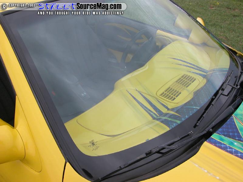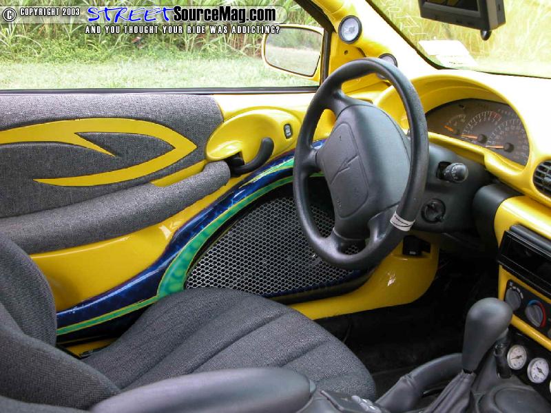 After starting there, Silvey continued to make mods throughout the interior. Again with help of friends and Pat Read, Chris rolled the graphics of the exterior into the custom door panels and dash. He also added the custom air gauges into the pillar of the Sunfire for an even more dramatic effect.