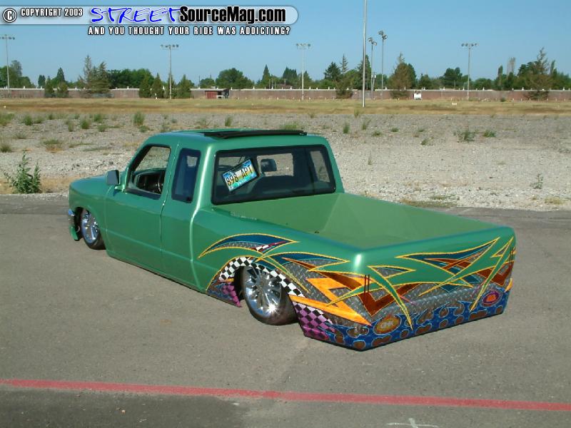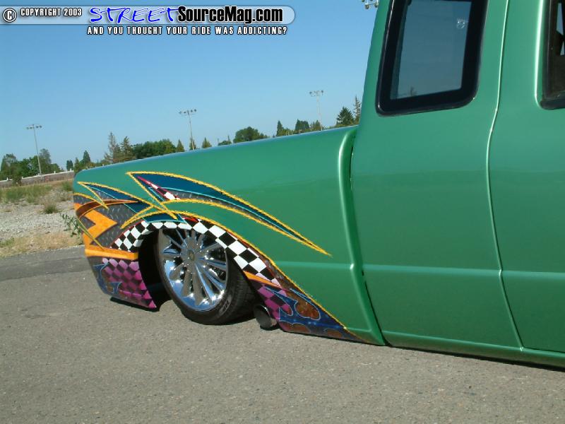 This wasn't low enough for Toms taste, as of yet, so Tom would then perform a 3-½ inch body drop. With the body down to a now much improved level, the rear would receive a set of 2500 lbs Firestone bags along with a set of 2600 lbs Firestone bags up front to help get the body up off the ground. Making sure the bags get the necessary air, four ½ inch Parker electric valves with ½ inch air line would be installed through out. Making room for the 17 inch Alba Reflections wrapped in Eagle Goodyear tires upfront, the battery would need to be relocated in the cab under the speaker box.