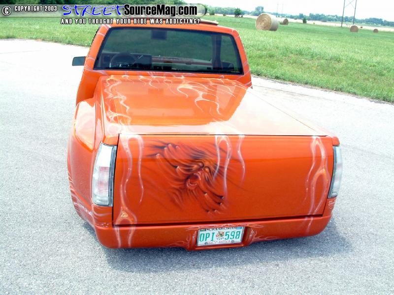 With the body complete, Ike would take the Chevy to Scott Shopp of Fat Cat Customs of Manford, OK. While in Scott's hands a Tangerine House of Kolor paint would be laid down. Needing more attention form show goers, Scott would then lay down a set of Planet Green and lime gold flames pinstriped in Passion Purple and Indigo Blue. Ike was now closer to what he had envisioned that very day he had bought this project.