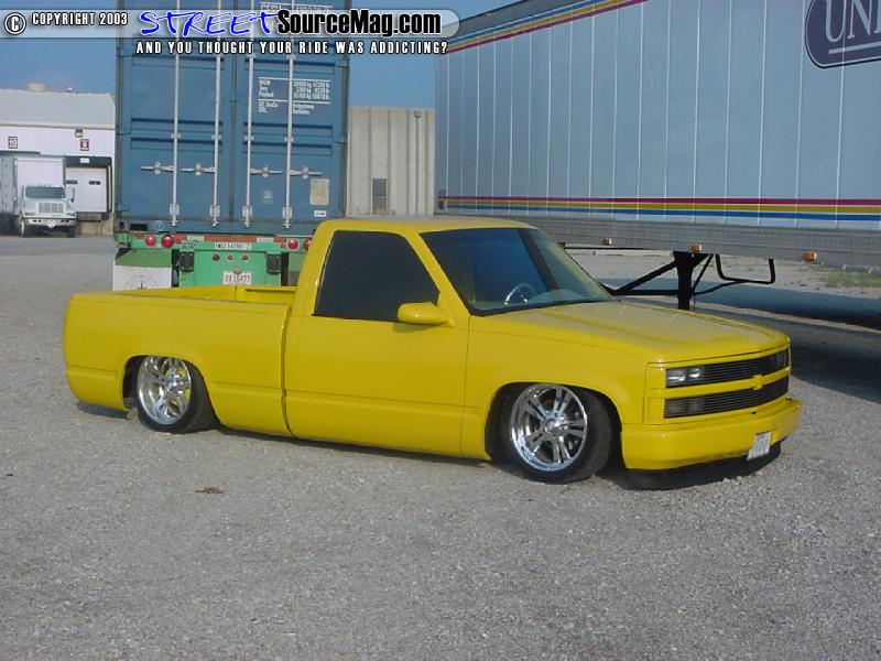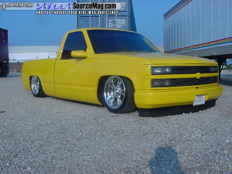 Before the competition yellow was laid down Brian welded up the door handles and antennae hole and ditched the factory taillights in exchange for a set of 98' caddy lights. To add to the exterior Kyle also ditched the factory "elephant ear" mirrors for a set of Street Scene mirrors and added a full phantom billet grill up front.
