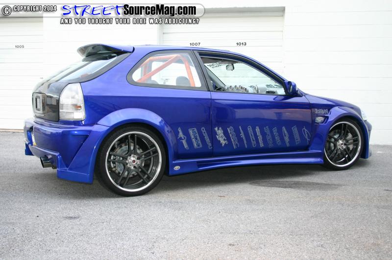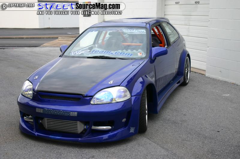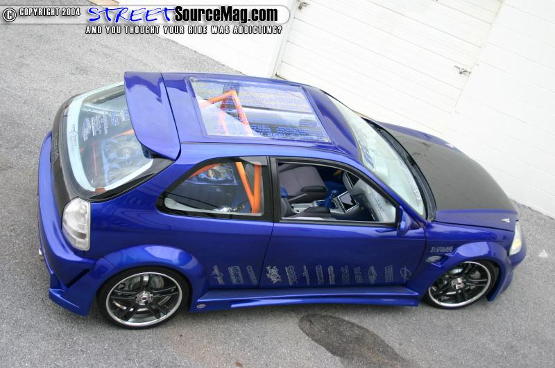 shaved gas door with a Sparco gas door molded in its place, custom metal fenders, a fully molded wide body kit, and a shaved antenna there were only a few things Dave wanted to change.   First would be to remove the ragtop that he didn’t particularly care for and replace it with a lexan piece to give him one big moon roof. Satisfied with that, Dave then installed a carbon fiber hood and hatch, and while he had the hatch off a set of clear taillights was swapped in.