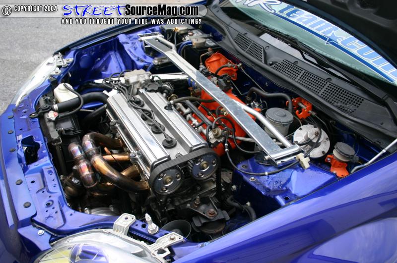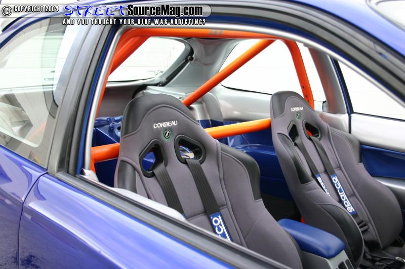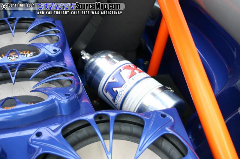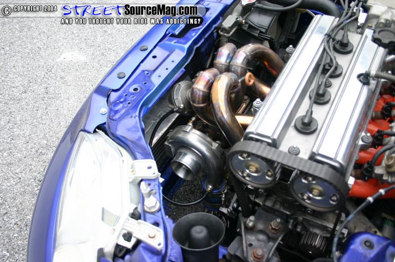 Other modifications to the motor include the Moroso oil pan, polished lightweight pulleys, Equal Length manifold, OBX exhaust, and a 50 shot of nitrous courtesy of NX. The turbo setup is taken care of with a Greddy Turbo Timer.