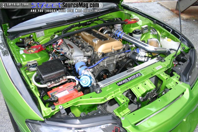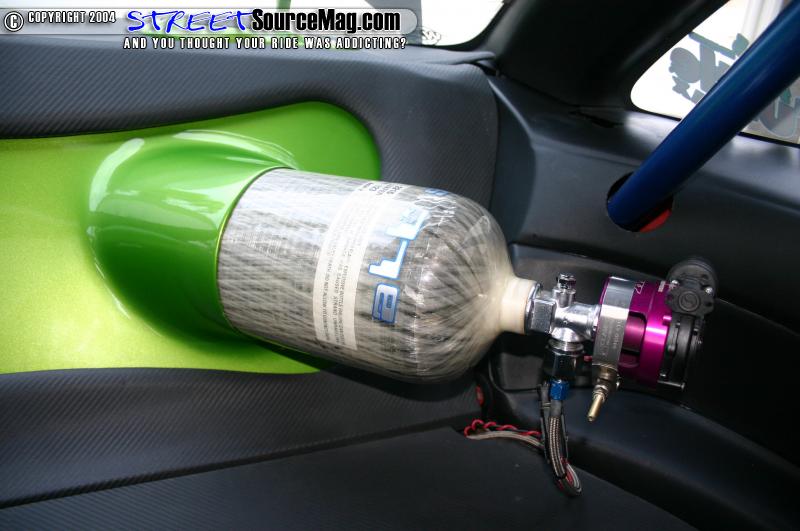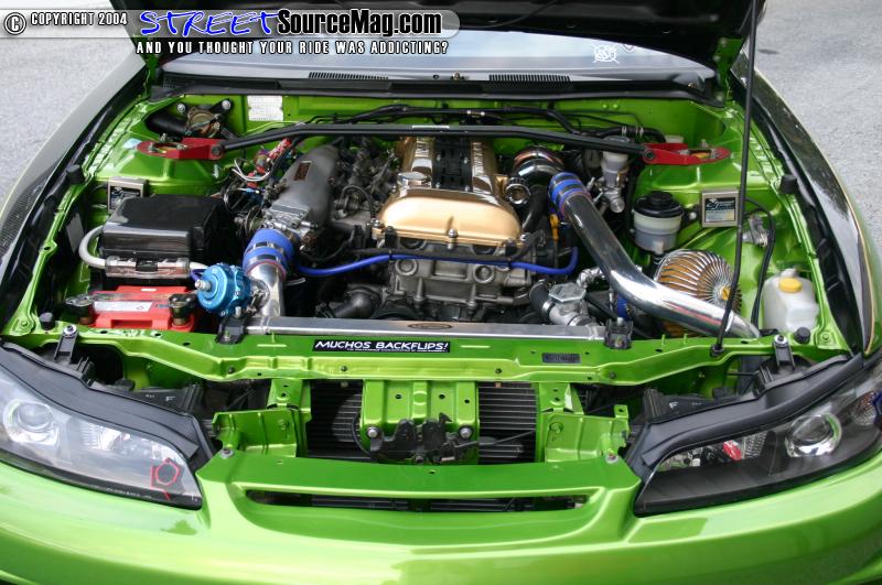 Under the hood sits a factory of pure HP. The SR20DET motor features a Magnaflow Titanium cat back exhaust, Veilside turbo manifold, Greddy Intake Manifold, Greddy down pipe, Tail blow off valve, Ractive Vacuum hoses, Nitrous Express direct port 100 shot, Nitrous Express intercooler kit, Silvia radiator with cooling fan, and competition clutch and flywheel.