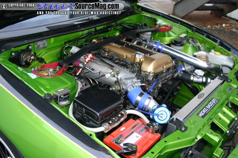Other dress ups done to the motor include T-Bolt clamps, painted valve cover, E&V silicone tubes, Weld spark plug cover, Carbon Fiber tray and fuse box cover, and Nisomo oil, fuel, and radiator cap. This 240sx pushes 375-wheel hp.