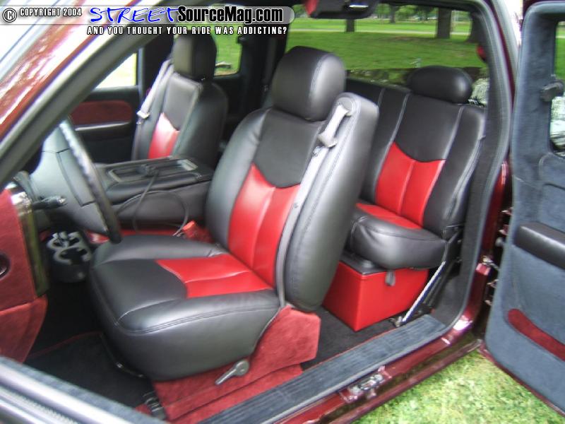 While most people do simple things to the interior, Jose wanted to make sure his truck was different. He covered everything but the seats in black and burgundy velour to match the exterior the of the truck. The seats he chose to do in matching black and burgundy vinyl. For in car entertainment Jose kept the truck practical by adding a Pioneer in dash screen along with two visor screens.
