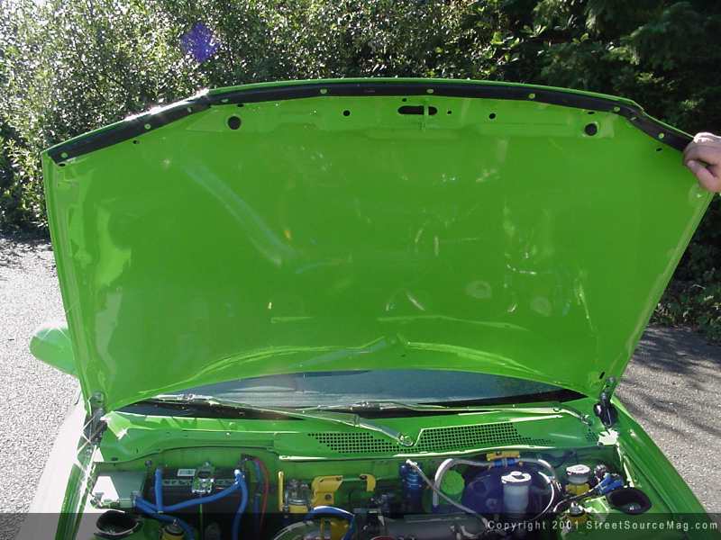 After liking the looks of the smooth hood it was time to apply the same to the under-side of the trunk lid. After shaving the sides, front and back of the Civic, it was time to remove the body seams and add a power sunroof.   Next on the agenda would be to bolt up a Wings West body-kit mixed with a Grill Craft grill and a set of projector headlights along with a stock 2-door coupe front bumper to give the front end a new over all look. Once the bodywork was complete, it was time to lay down the PPG Kawasaki green paint. Friends Tom Jacobs and Jason Haase performed the bodywork, while Matt Brown applied the paint.