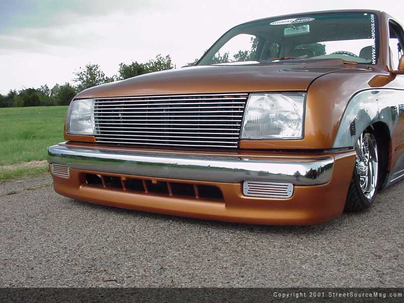 Also to add a little touch to the front end, Eric bolted up billet bumper light covers and shaved the corner lamps. Next it was onto the bed to give an over all smooth look. One of the first things to go was the gas filler door, which was located inside the bed. After that the bed was covered with a new sheet metal bed floor and acquired some curved bed corners.
