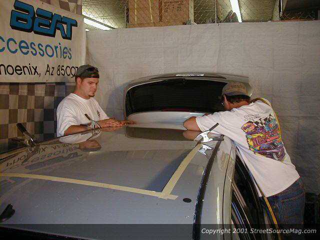 Step 10: Although you can also use a sawzall for this, Dave is using an air nibbler to keep the sheetmetal from distorting. Step 11: Using clamps to hold the roof up, as well as a spotter, Dave finishes cutting the roof.