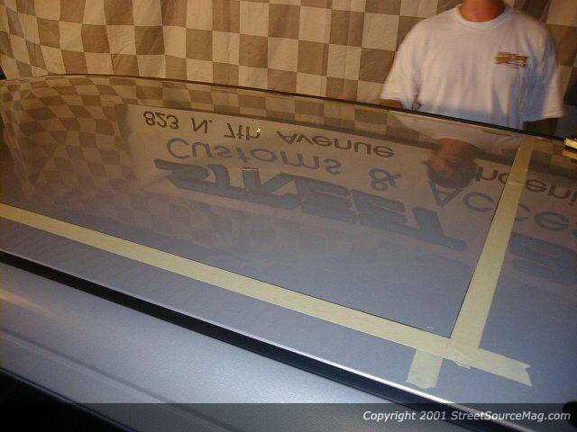 Step 8: Using tape as a guideline, mark out the area you will be cutting. Using the tape helps keep the paint from getting damaged in the cutting process. Step 9: Using a Unibit, John starts the process by opening up a hole in the corner. The rounded edges also help keep the roof from having problems later. The hole he is making is also to ease in the nibbler we will be using to cut the roof.