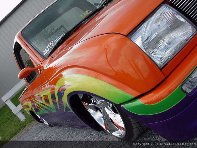In the midst of the current stance being a gratifying one, the body would be next on the hit list. Beginning from the front and moving to the rear, the hood was left alone with Todd and the crew performing an engine drop. A Trenz grille was installed for the phantom look, while a set of 4x4 fenders with shaved corner lamps where mounted to give the Taco a wider stance. Above the stock bumper and snug against the Trenz grille you will find a set of 2000 Tacoma headlights. Moving towards the rear of the Taco would mean not missing a panel along the way. With the antenna shaved, the door handles would also need to go. Other stock items needing placed in the trash would be the mirrors, which were replaced with a much sportier set. Atop the cab you will find a Street Beat ragtop to allow the Virginia sun through on the warm summer days.