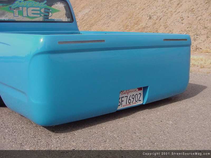 The tailgate was then smoothed out with a skin combo and molded to the bed for an over all smooth look. After many dragging episodes Mike found the Taco back down to Anaheim Prestige Auto body to rework the rear Alter Images skin combo after dragging it along the California roads. The taillights where shaved and a set of Hi Tech LED's, which were designed by Mike, and were flush mounted into the roll pan. Mike performed most of the long list of modifications. Chris and Eurocraft Collision of Middletown, NY, are responsible for the taillights, gas filler door, cab seams and corner lamps.