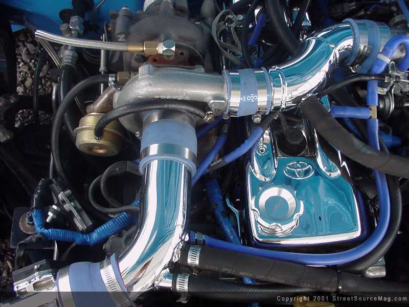 For starters, Mike would drop off the Taco to the crew from EL Prototypes for some major performance quirks. While in their hands, a Magnaflow stainless 3-inch Manifold would be installed along with an 11psi T-3 Turbo. By means of the new engine upgrade, the influence of more fuel would be important, making sure to pass this along would be the use of a Holley fuel pump. The next step would be to install a LC Engineering Billet flywheel, which had been lightened to 11 lbs, along with an LC Engineering clutch disc and pressure plate. Helping to cool things off, an electric Flexalite cooling fan would then be installed. Maintaining the engines breathing would be important with the added power. To bring the air in, a custom intake system along with a K&N filter would be mounted. Providing the engines exhaust would be a 3-inch stainless system with the cat removed for added power. The exhaust system was raised above the frame rails to ensure there was enough allowed clearance at low stances. With an engine built like Mikes, ensuring a good spark is one of importance. Nology 10mm plug wires where installed along with a 120 amp custom alternator. Giving a little more kick, the ignition was advanced a few degrees. While handing the engine bay some glamour, the valve cover was chromed along with a few other random items.