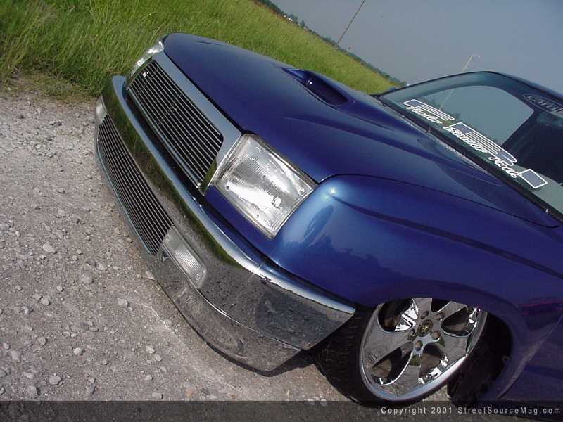 With his truck coming along , Brandt next turned to his fellow Negative Camber member Chris Bostick for some necessary parts to set the Tacoma apart from the rest. Brandy purchased a 2000 Toyota 4 Runner hood and fenders from Chris. Next Brandt purchased the headlights and grille from a 1997 4 Runner and contacted FBI to build some billet inserts to give it more of a modern look. FBI was also given the task of chroming and adding billet to the 1995 4 Runner front bumper and valance that would adorn Brandt's Tacoma.  Brandt then took the truck back to BYC where Mike and the boys got back to work. Mike and his crew shaved the corner lamps and installed the new fenders, then had to install all of the new front parts and pieces, which was no easy task by any means.