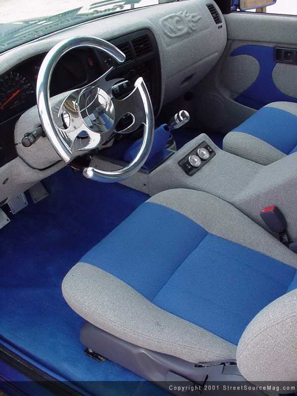 Josh also shaved the arm and headrests for a cleaner look. The headliner received special graphics in the tweed. The truck was coming along quite nicely and Brandt wanted to make sure no one would have the opportunity to steal his prize possession. With that in mind, Eric Ervin of Car Toys installed an Alpine 8063 alarm, which not only protects Brandt's truck, but allows him to pop either door, roll down the window or drop the truck flat to the ground with the touch of a button.