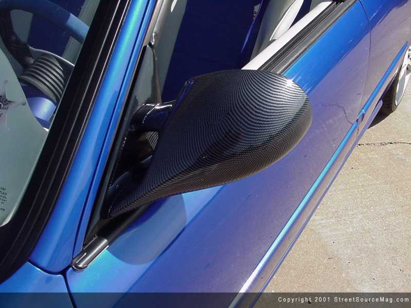 Moving forward, the gas filler door was welded shut and a motorcycle gas door was molded in its place. All four door handles where then removed and the holes welded shut for a smoother look.  Not totally happy with the over all body, the stock mirrors would be ditched and replaced with a carbon fiber set for a much racier glance.