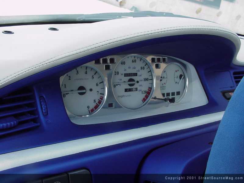 Keeping the front of the cab at a top custom level, the steering wheel was replaced with one from MOMO along with the install of a billet rearview mirror.  The gauges would then be removed in favor for a set of white face gauges and all of the vents where then dyed blue. Accompanying the new racing seats would be a set of Tenzo-R racing harnesses. But the custom interior wouldn't stop there; the rear deck would be removed of the 3rd brake along with the speaker pods and wrapped.