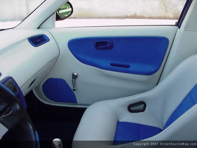 All of the stock seats where subsequently removed and set aside for 2 sets of Corbeau racing seats. Before mounting up the seats, they would be wrapped with white vinyl and blue ultra suede materials.