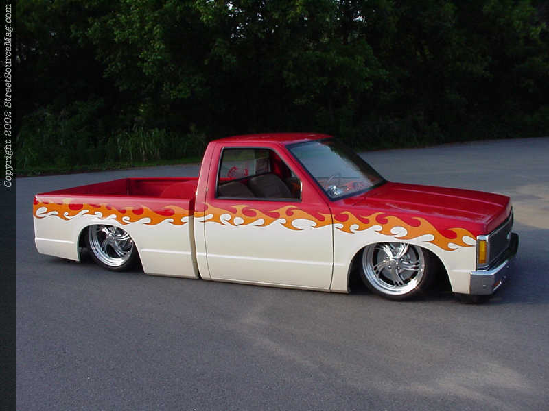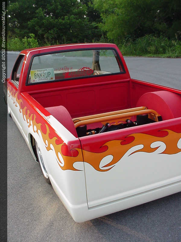 Jimmy also removed all emblems, shaved the body line, tailgate handle and taillights. Ten inch neon tubes custom mounted in the rear shine down and reflect off of the body, acting as taillights on the S-10 now. To top things off, Les installed phantom grille shell from F.B.I. and then called upon Mitch Kennedy and Denny Phillips of Meridian, Mississippi for paint duties.