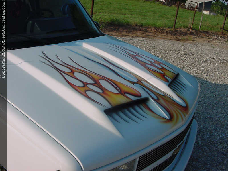 With all the bolt-ons in place Allan dropped his truck off at Moore Head Designs in Oklahoma City to have the doors shaved and the wild yellow and orange tribal flames layed out to perfection.